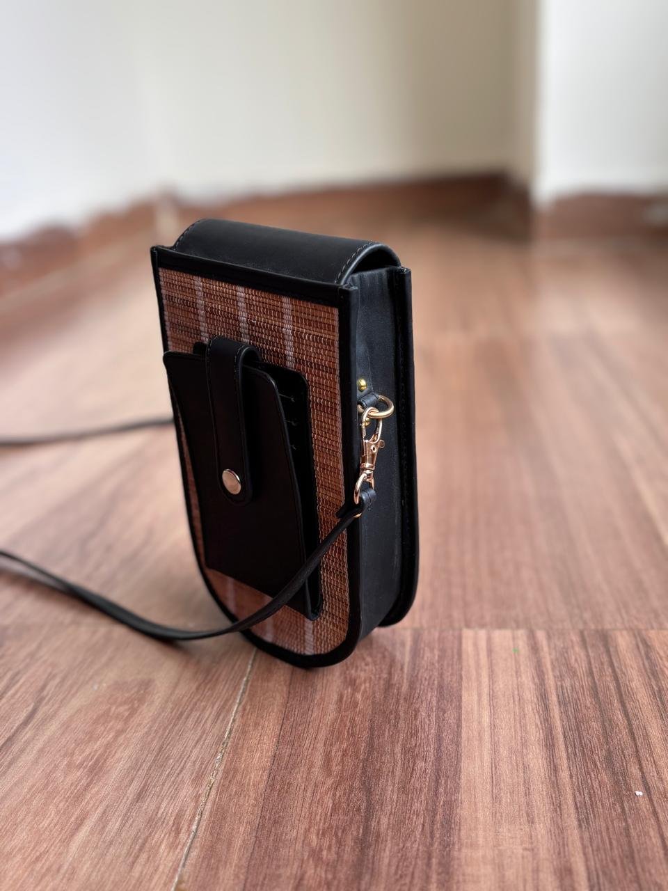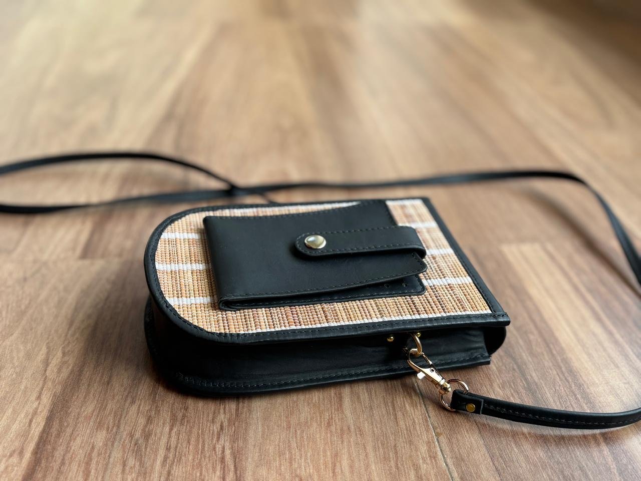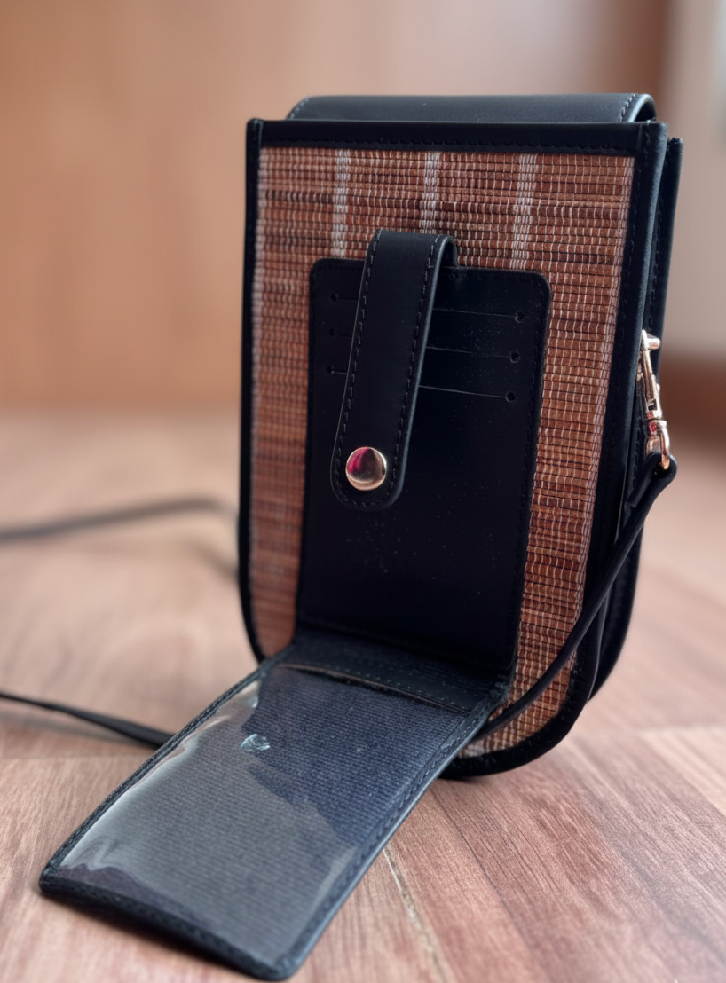 A perfect blend of elegance and everyday convenience, this Mobile Sling Bag is designed for those who love compact style without compromising function. Featuring a sleek black flap paired with a textured woven from cardamom mats , it brings a modern, earthy charm to your daily carry.