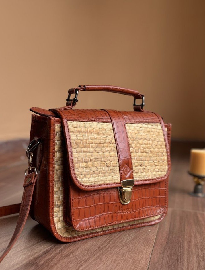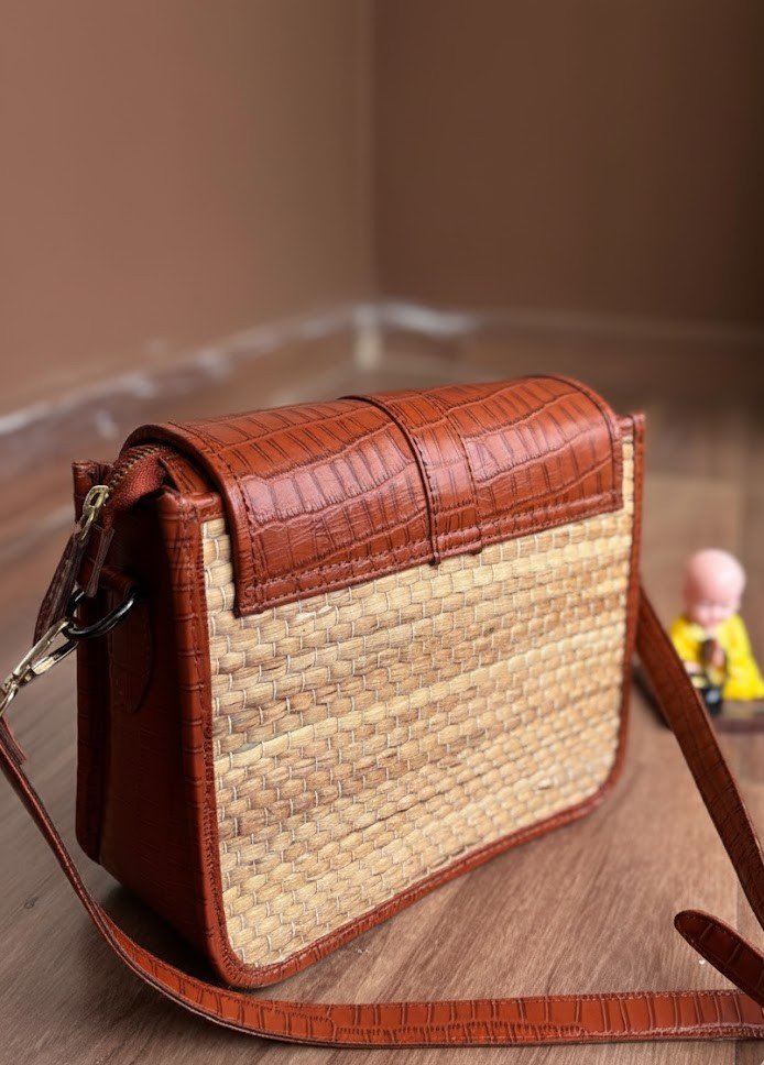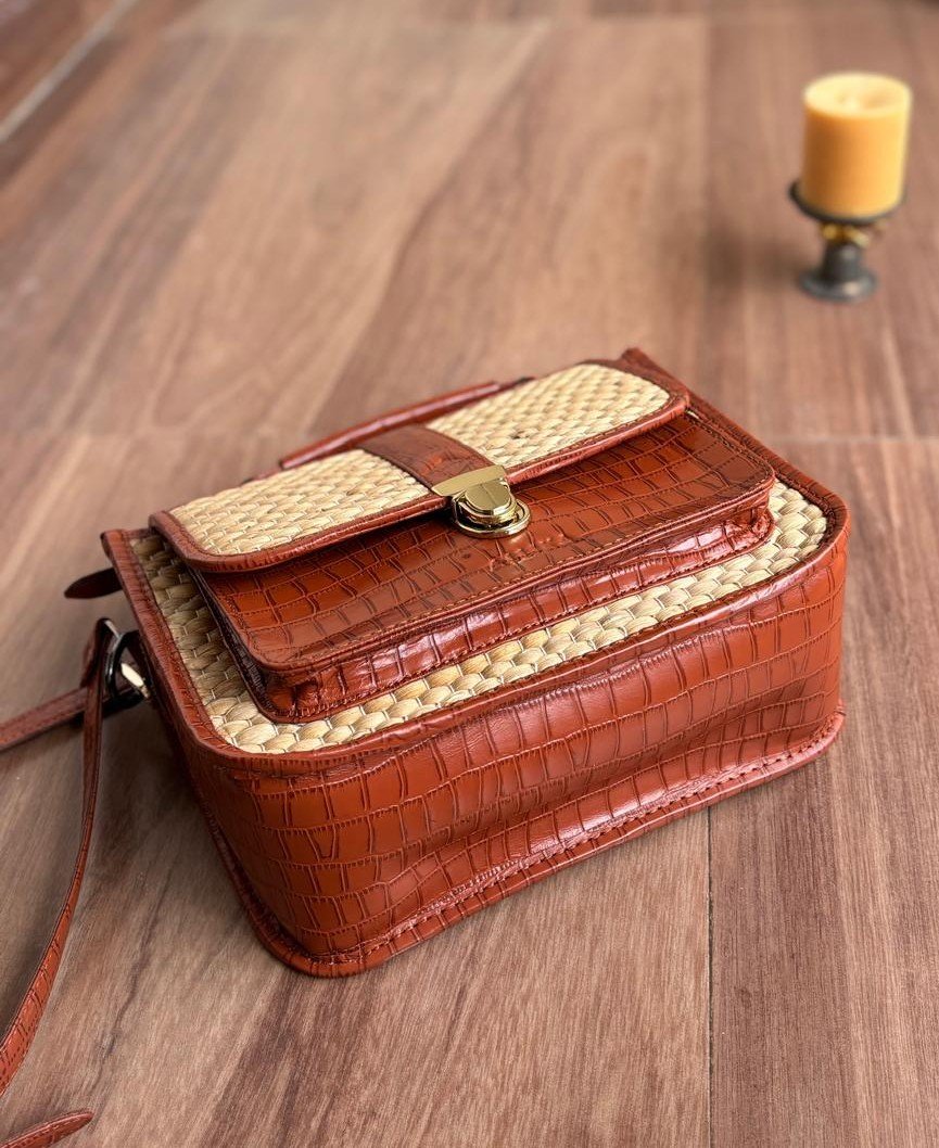 A perfect mix of elegance and everyday utility, this Subtle Sling Bag is crafted in a rich Cedar Tan croc-textured finish paired with a beautifully woven cane front. Compact yet thoughtfully designed, it offers multiple compartments to keep your essentials neatly organized while adding a natural, artisanal charm to your style.
